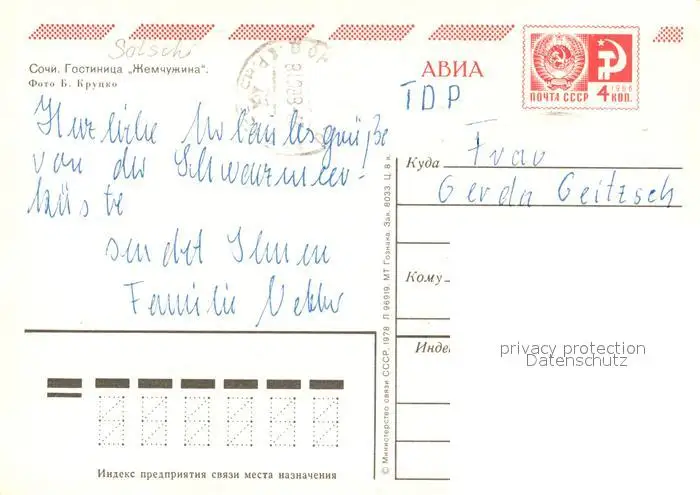 Sotschi_Sochi Hotel postalisch gelaufen nach 1965 Ganzsache (eingedruckte Briefmarke) Erhaltung siehe scans [NatalD47] Ganzsache (eingedruckte Briefmarke) NataID47