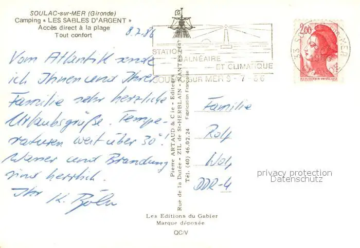 Soulac-sur-Mer Camping Les Sables d'Argent Soulac-sur-Mer postalisch gelaufen 1986 Erhaltung siehe scans [FriedD77] Frierer