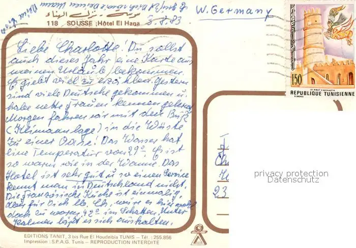 Sousse Hotel El Hana Piscine Sousse postalisch gelaufen 1983 Erhaltung siehe scans [FriedD77] Frierer