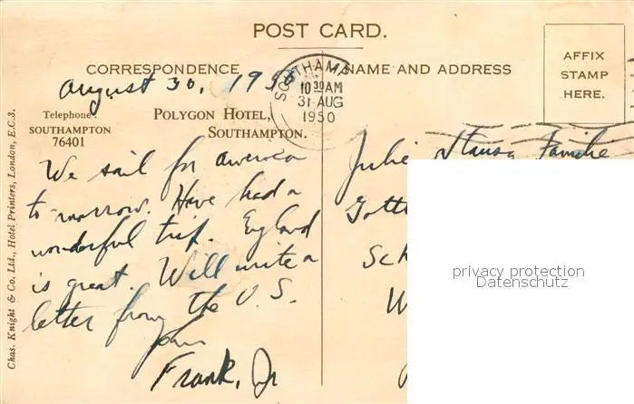 Southampton Polygon Hotel Southampton postalisch gelaufen 1950 Erhaltung siehe scans [WerneD78] WernPID7
