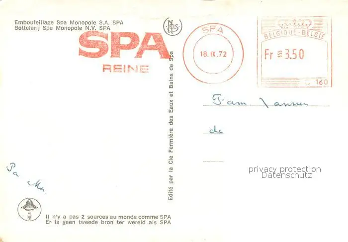 Spa_Liege Embouteillage Botellarij Spa Monopole Spa_Liege postalisch gelaufen 1972 Erhaltung siehe scans [WerneD78] WernPID7