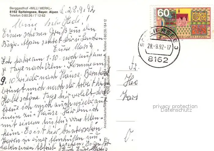 Spitzingsee Berggasthof Willi Merkl Spitzingsee postalisch gelaufen 1992 Erhaltung siehe scans [KathaD81] Kathoren