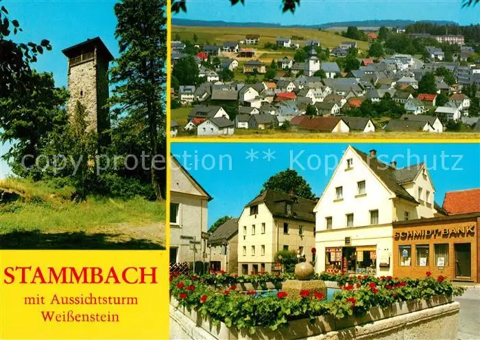 AK / Ansichtskarte Stammbach Aussichtsturm Weissenstein Brunnen Teilansicht Erholungsort Stammbach