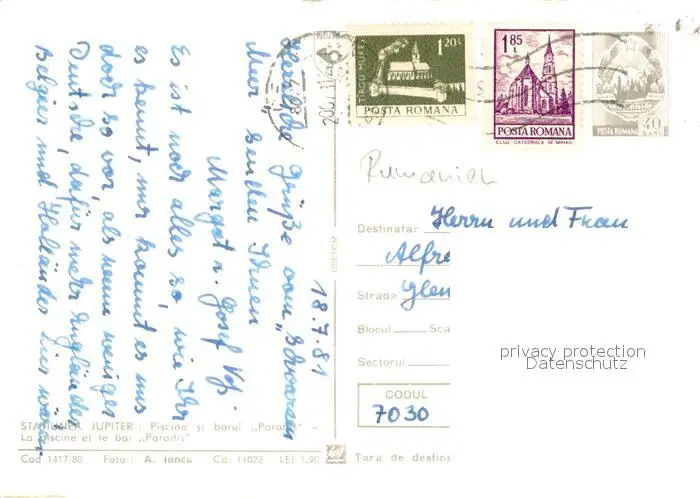 Statiunea_Jupiter Piscine de la Bar Paradis postalisch gelaufen 1981 Erhaltung siehe scans [FriedD77] Frierer