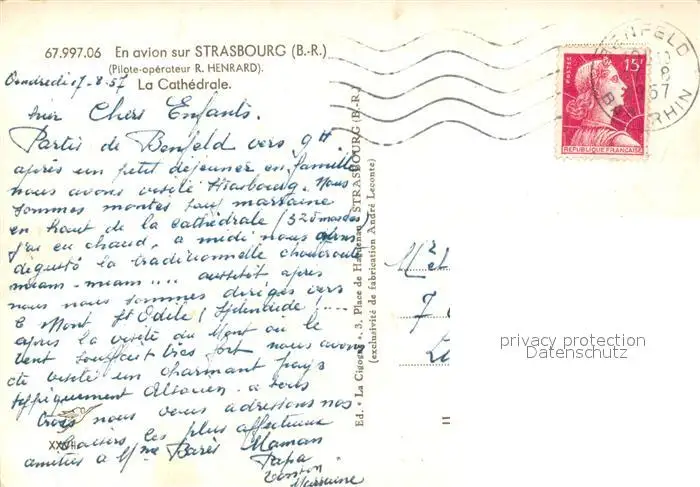 Strasbourg_Alsace La Cathédrale vue aérienne Strasbourg Alsace postalisch gelaufen 1957 Erhaltung siehe scans [FriedD77] Frierer
