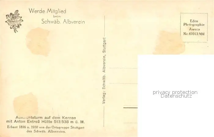 Stuttgart Aussichtsturm auf dem Kernen mit Entress Huette Stuttgart postalisch nicht gelaufen 1921-1965 Erhaltung siehe scans [WerneD78] WernPID7