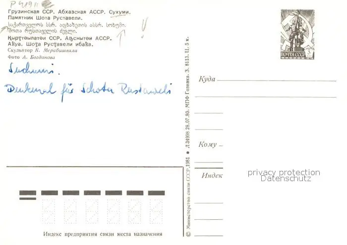 Suchumi Demkmal Rustawelie Suchumi postalisch nicht gelaufen nach 1965 Erhaltung siehe scans [IrynaD87] Iryn PID