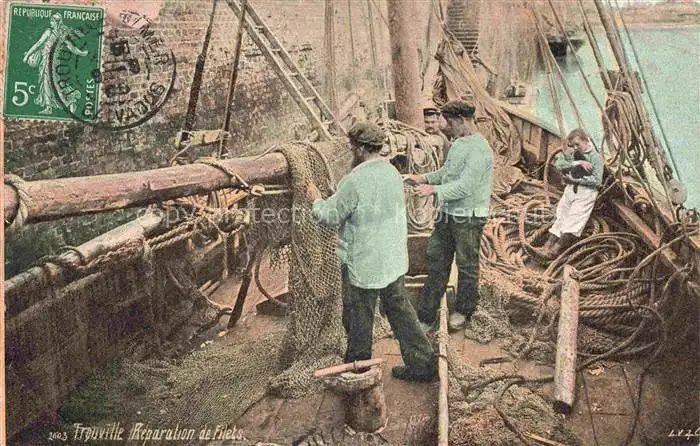 14074002 TROUVILLE -SUR-MER 14 Calvados Bateau de pêche Réparation de filets postalisch gelaufen Erhaltung siehe scans [FriedD77] carte postale Frie Katcode 11170014314715