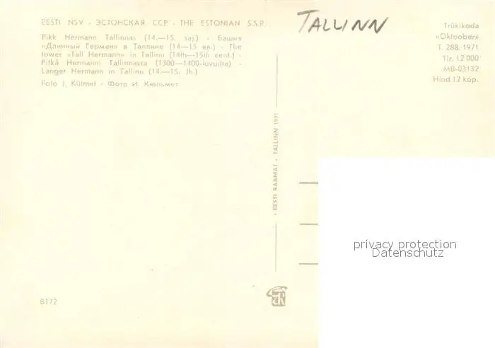 Tallin The Tower Tall Hermann Tallin postalisch nicht gelaufen 1971 Erhaltung siehe scans [FriedD77] Frierer