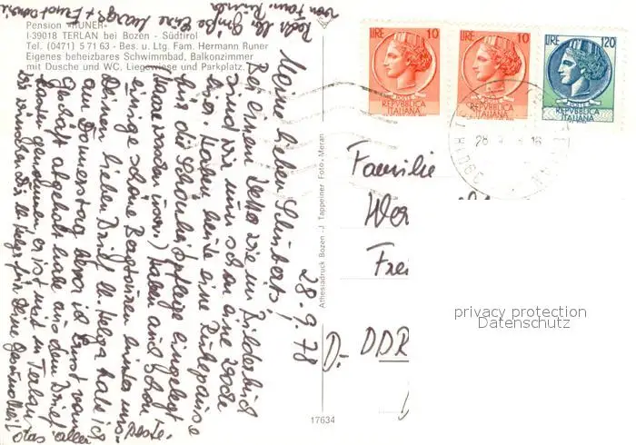 Terlan Pension Runer Pool Terlan postalisch gelaufen 1978 Erhaltung siehe scans [WerneD78] WernPID7