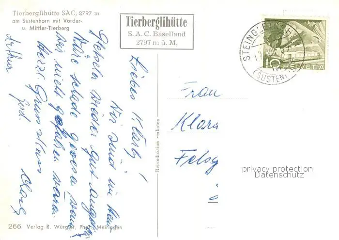 Tierberglihuette_2795m_BE Sustenhorn Tierberg postalisch gelaufen 1959 Erhaltung siehe scans [LiesaD40] LiesID40