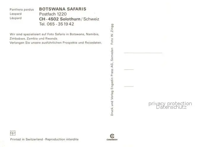 Tiere Leopard Botswana Safaris Solothurn postalisch nicht gelaufen nach 1965 Erhaltung siehe scans [PaolaD17] PaolPID1