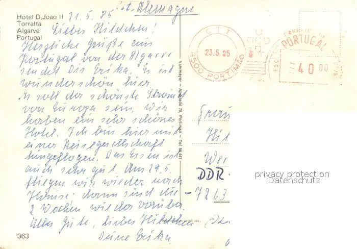 Torralta Hotel D. Joao Torralta postalisch gelaufen 1985 Erhaltung siehe scans [LiesaD40] LiesID40