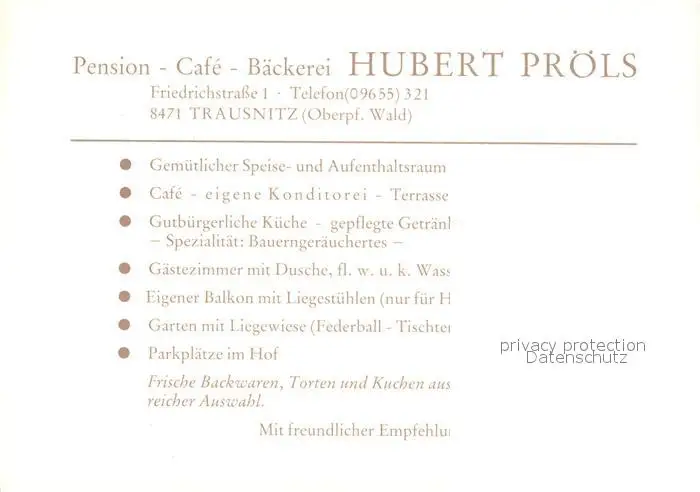 Trausnitz Pension Hubert Proels Trausnitz postalisch nicht gelaufen nach 1965 Werbekarte (keine Postkarte) Erhaltung siehe scans [WerneD78] Werbekarte (keine Postkarte) WernPID7