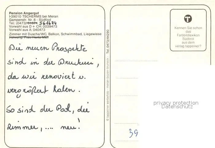Tscherms Pension Angergut Tscherms postalisch nicht gelaufen nach 1965 Erhaltung siehe scans [PaolaD17] PaolPID1