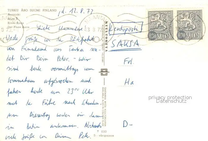 Turku Aura Kirche Turku postalisch gelaufen 1972 Erhaltung siehe scans [KathaD81] Kathoren