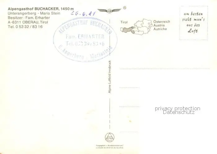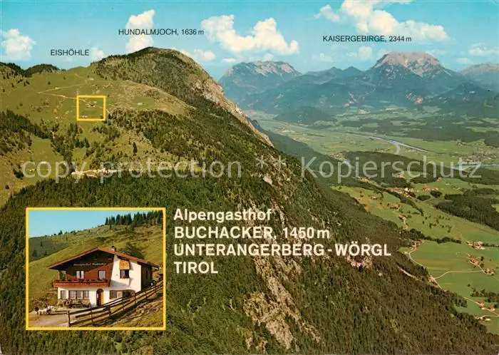 Unterangerberg_Tirol_AT Alpengasthof Buchacker Blick zum Kaisergebirge postalisch nicht gelaufen 1981 Fliegeraufnahme Erhaltung siehe scans [FriedD77] Fliegeraufnahme Frierer