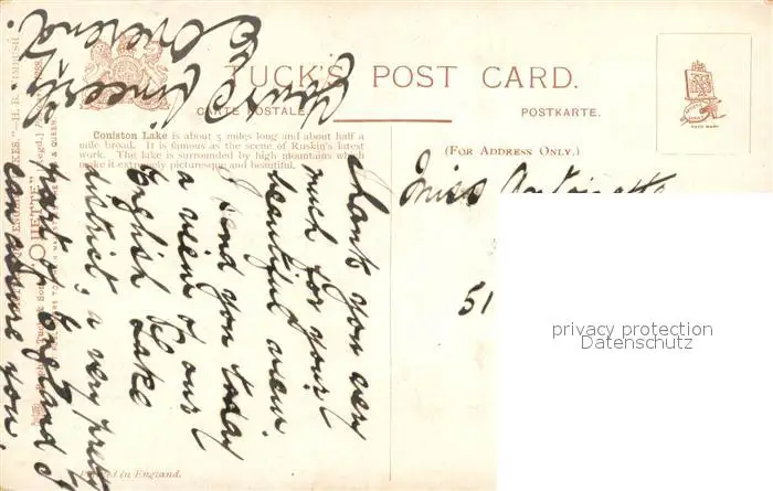 Verlag_Tucks_Oilette_Nr. 7288 Coniston Lake postalisch gelaufen 1910 Erhaltung siehe scans [PaolaD17] PaolPID1