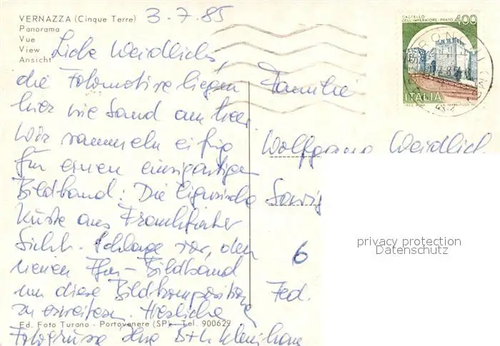Vernazza Panorama Vernazza postalisch gelaufen 1985 Erhaltung siehe scans [WerneD78] WernPID7