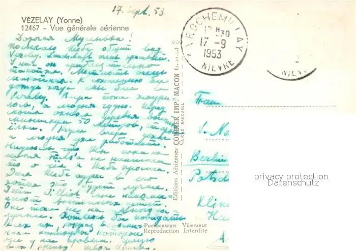 Vezelay Vue aérienne Vezelay postalisch gelaufen 1953 Erhaltung siehe scans [FriedD77] Frierer