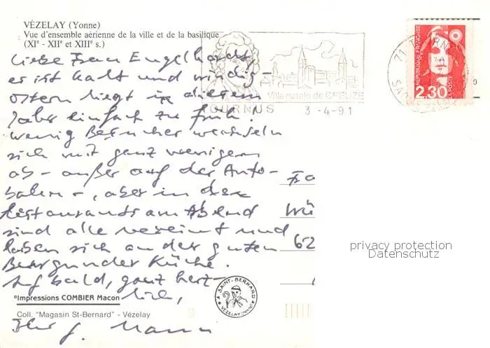 Vezelay_89 Vue d ensemble de la ville et de la basilique vue aérienne postalisch gelaufen 1991 Fliegeraufnahme Erhaltung siehe scans [FriedD77] Fliegeraufnahme Frierer