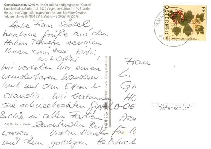 Virgen Gottschaualm Venedigergruppe Virgen postalisch gelaufen 2010 Erhaltung siehe scans [FriedD77] Frierer