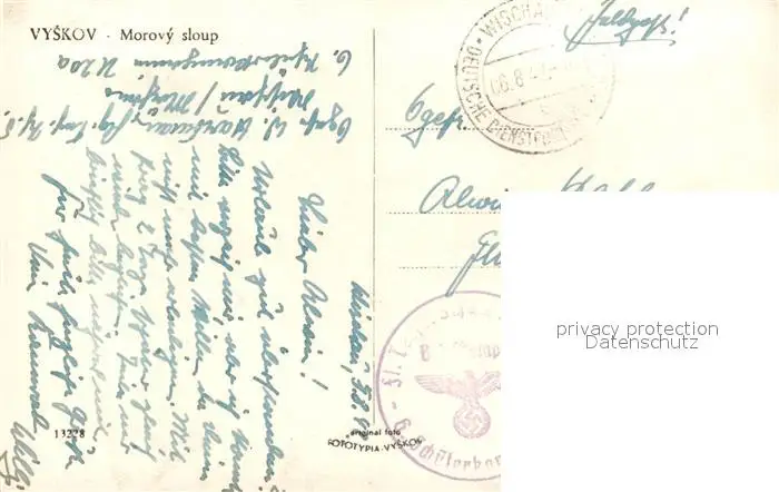 Vyskov Morovy sloup Vyskov postalisch gelaufen 1943 Feldpost Erhaltung siehe scans [LiesaD40] Feldpost LiesID40