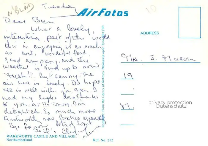 Warkworth Castle and village aerial view postalisch nicht gelaufen nach 1965 Erhaltung siehe scans [FriedD77] Frierer