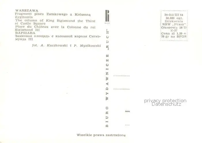 Warszawa The column of King Sigismund the Third at Castle Square Warszawa postalisch nicht gelaufen nach 1965 Erhaltung siehe scans [LiesaD40] LiesID40