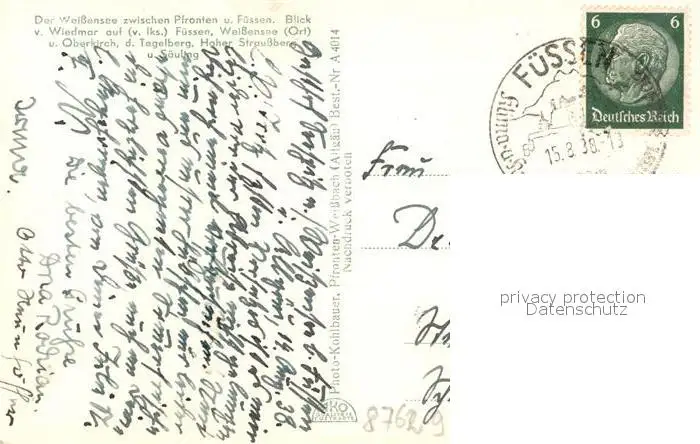 Weissensee_Fuessen Landschaftspanorama Alpen Weissensee Fuessen postalisch gelaufen 1938 Erhaltung siehe scans [FriedD77] Frierer