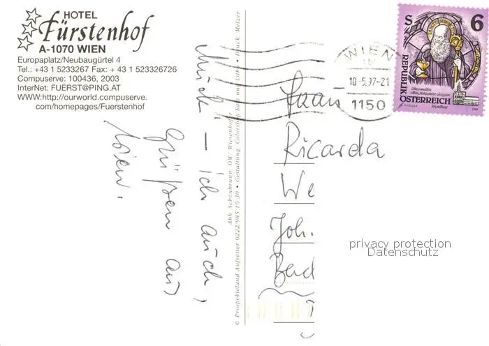 Wien Hotel Fuerstenhof Wien postalisch gelaufen 1997 Erhaltung siehe scans [LiesaD40] LiesID40