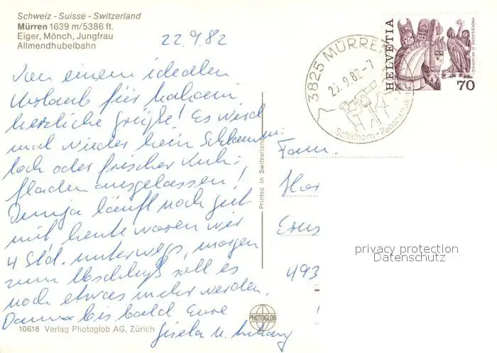 Zahnradbahn Allmendhubelbahn Muerren Eiger Moench Jungfrau Zahnradbahn postalisch gelaufen 1982 Erhaltung siehe scans [PaolaD17] PaolPID1