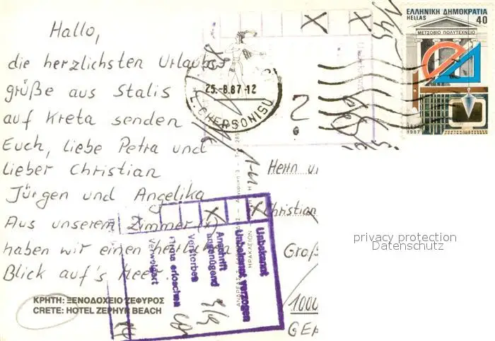 Zephyr_Kreta Zephyr Beach Hotel Panorama Zephyr Kreta postalisch gelaufen 1987 Erhaltung siehe scans [FriedD77] Frierer