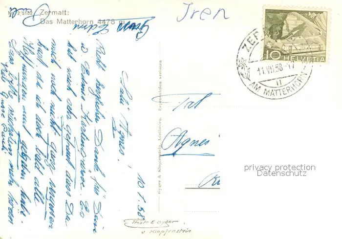 Zermatt_VS mit Matterhorn Zermatt_VS postalisch gelaufen 1958 Erhaltung siehe scans [FriedD77] Frierer