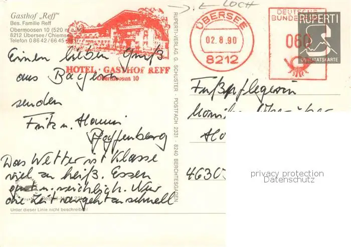 uebersee_Chiemsee Gasthof Reff postalisch gelaufen 1990 Erhaltung siehe scans [FriedD77] Frierer