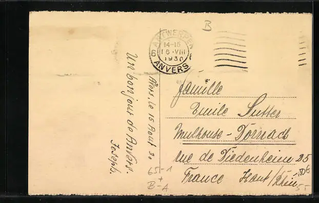 Personenbezogene Daten auf der Rückseite der Karte wurden durch blauen Textmarker unkenntlich gemacht. Die blauen Stellen sind auf die Vorderseite durchgeweicht und wirken sich negativ auf das Postkartenfoto aus