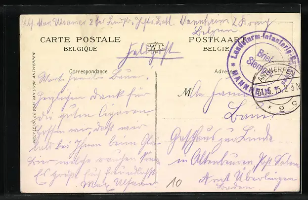 Personenbezogene Daten auf der Rückseite der Karte wurden durch blauen Textmarker unkenntlich gemacht. Die blauen Stellen sind auf die Vorderseite durchgeweicht und wirken sich negativ auf das Postkartenfoto aus