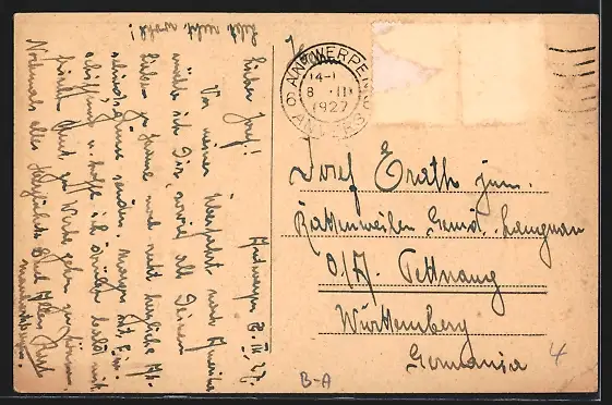 gelaufen 1927, Briefmarke entfernt, rückseitig Oberflächenschaden, Eckknick unten li., guter Zustand
