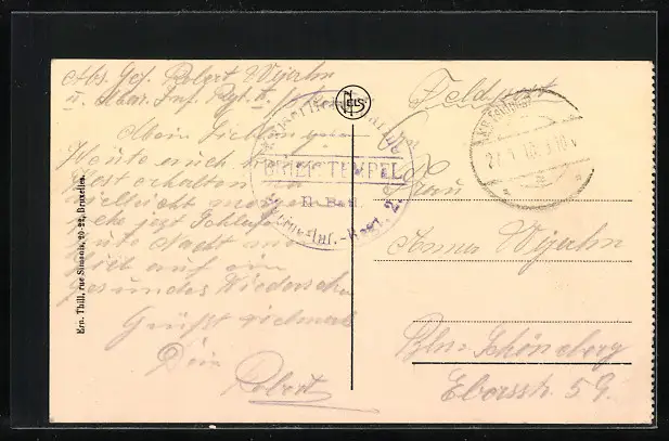 Personenbezogene Daten auf der Rückseite der Karte wurden durch blauen Textmarker unkenntlich gemacht. Die blauen Stellen sind auf die Vorderseite durchgeweicht und wirken sich negativ auf das Postkartenfoto aus