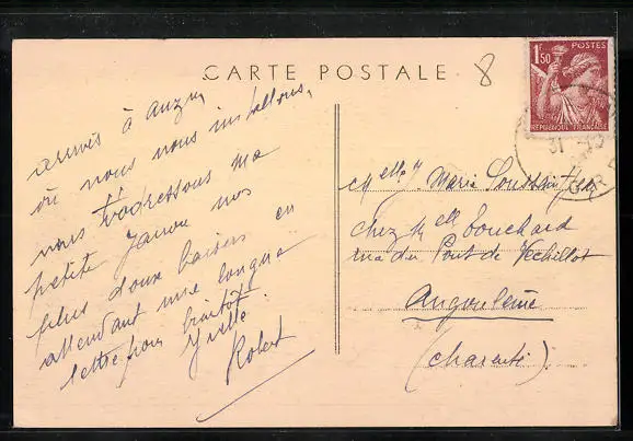 Personenbezogene Daten auf der Rückseite der Karte wurden durch blauen Textmarker unkenntlich gemacht. Die blauen Stellen sind auf die Vorderseite durchgeweicht und wirken sich negativ auf das Postkartenfoto aus