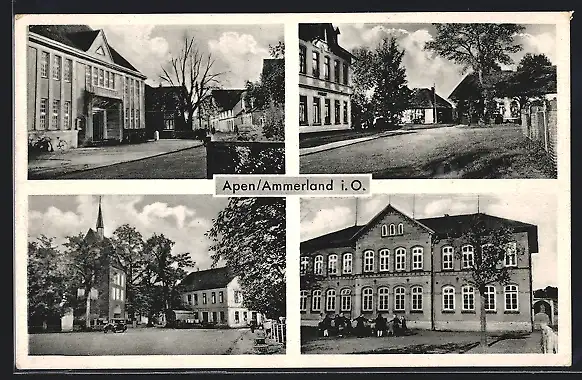 AK Apen /Ammerland i. O., Strassenpartie, Schule, Kirche