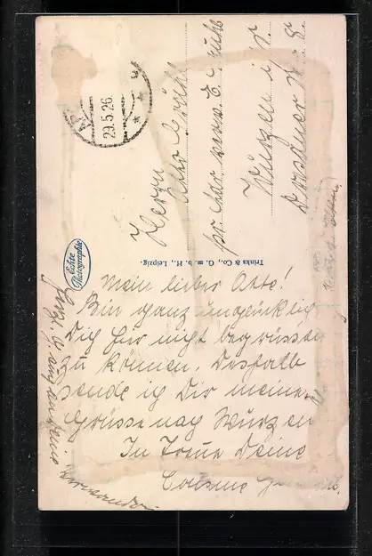 Personenbezogene Daten auf der Rückseite der Karte wurden durch blauen Textmarker unkenntlich gemacht. Die blauen Stellen sind auf die Vorderseite durchgeweicht und wirken sich negativ auf das Postkartenfoto aus