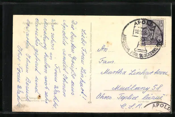 Personenbezogene Daten auf der Rückseite der Karte wurden durch blauen Textmarker unkenntlich gemacht. Die blauen Stellen sind auf die Vorderseite durchgeweicht und wirken sich negativ auf das Postkartenfoto aus