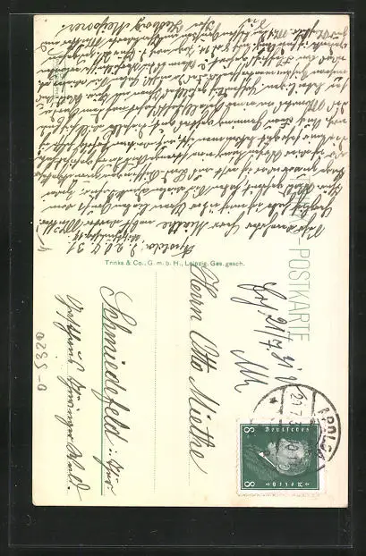 Personenbezogene Daten auf der Rückseite der Karte wurden durch blauen Textmarker unkenntlich gemacht. Die blauen Stellen sind auf die Vorderseite durchgeweicht und wirken sich negativ auf das Postkartenfoto aus