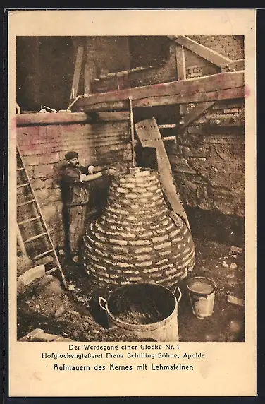 AK Apolda, Hofglockengiesserei Franz Schilling Söhne, Aufmauern des Kerns mit Lehmsteinen