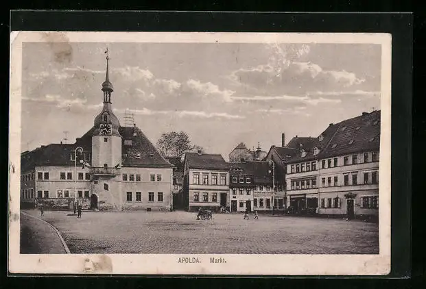 Personenbezogene Daten auf der Rückseite der Karte wurden durch blauen Textmarker unkenntlich gemacht. Die blauen Stellen sind auf die Vorderseite durchgeweicht und wirken sich negativ auf das Postkartenfoto aus