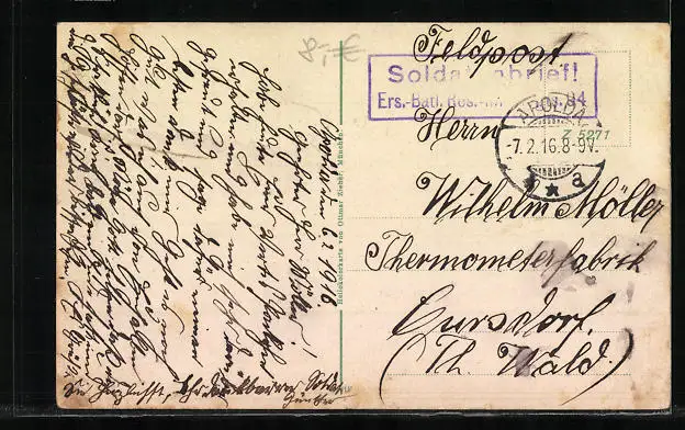 gelaufen 1916 als Feldpost, leichter Eckschaden li. oben, Eckknick re. unten, guter Zustand