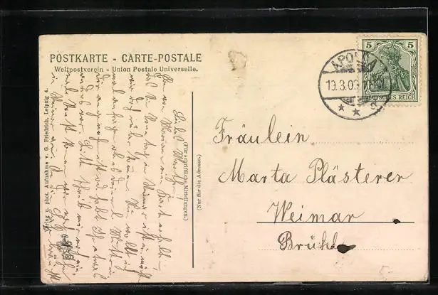 alte Ansichtskarte, gelaufen 1900, Eckknicke re., Stecknadelloch oben, sonst guter Zustand