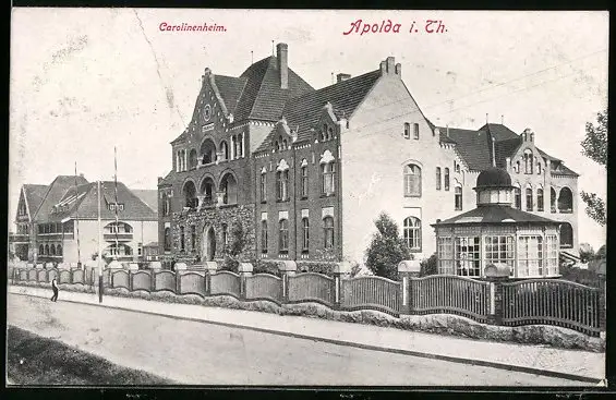 AK Apolda /Th., Carolinenheim mit Nachbargebäuden und Strasse