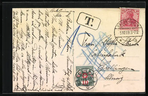 Personenbezogene Daten auf der Rückseite der Karte wurden durch blauen Textmarker unkenntlich gemacht. Die blauen Stellen sind auf die Vorderseite durchgeweicht und wirken sich negativ auf das Postkartenfoto aus